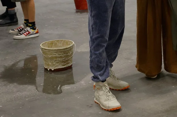 By intervening directly in the existing architecture of the exhibition space, Fountain (Bad Landlord) involves the institution itself in the question of precarity. It points to crises of real-estate within the world of art exhibitions, as well as recalling, for many, personal crises of rented housing. The ceramic buckets that catch the drips play a role simultaneously as art objects, fulfilling their function to the art exhibition space, as well as water receptacles, fulfilling their function as real buckets. Their materiality suggests the ossification of temporary solutions, as crises management becomes the norm.